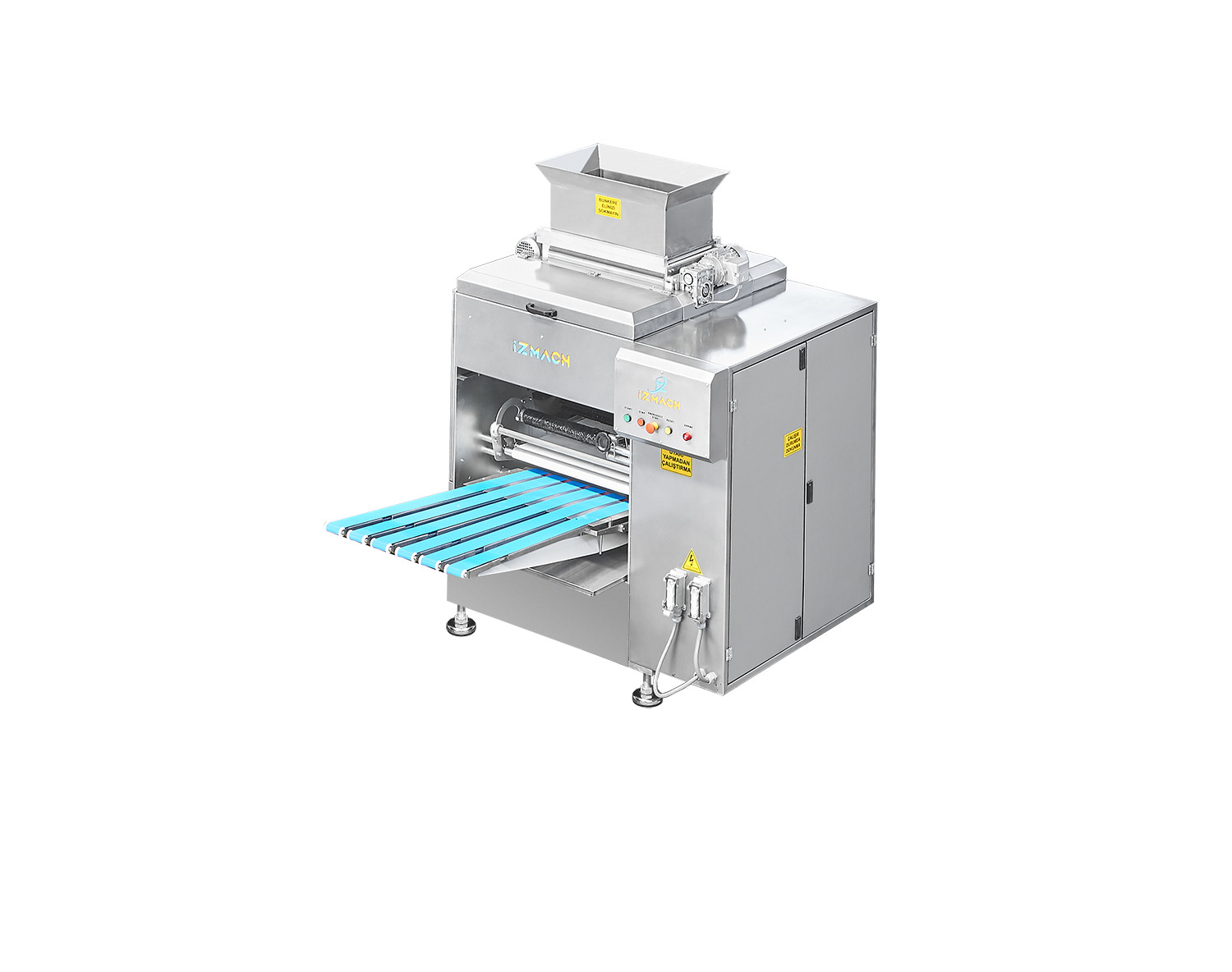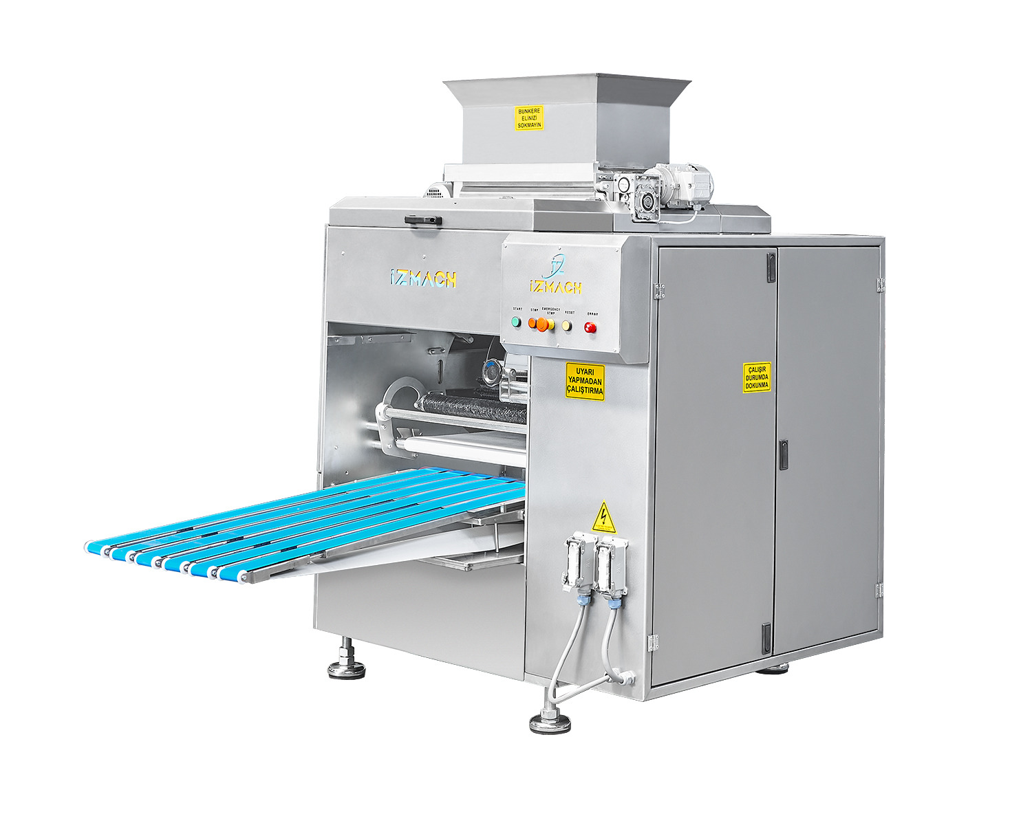Kullanıcı Dostu PLC Arayüz: Tüm makine ayarları, entegre PLC kontrollü dokunmatik ekran üzerinden hassas ve kolay bir şekilde yönetilebilir. Ergonomik Tasarım: Mekanik kalibrasyonlar basitleştirilmiş olup, operatör eğitimi ve makine adaptasyonu son derece hızlıdır. Akıllı Reçete Yönetimi: Kullanım ve üretim parametreleri hafızaya kaydedilerek standart üretim kalitesi süreklilik arz eder. Hız Kontrolü: Tüm konveyör bantların hızları, üretim ihtiyacına göre bağımsız olarak ayarlanabilir. Görsel Arıza Bildirimi: Olası elektrik ve elektronik arızalar, PLC ekranında görsel ve yazılı uyarılarla operatöre anlık olarak bildirilir. Hijyen ve Bakım Kolay Temizlenebilir Modüler Yapı: Başta bantlar ve hareketli aksamlar olmak üzere, parçaların sökülüp takılması alet gerektirmez; günlük temizlik ve hijyen standartları kolayca sağlanır. Temiz Çalışma Ortamı: Hamur kesimi sırasında optimize edilmiş un kullanımı sayesinde çalışma ortamı temiz kalır, hamur yüzeyinde un kalıntısı oluşmaz. ALTILI HAMUR KESME VE YUVARLAMA MAKİNESİ Hamur Gramajlama: 40-160 gr. Aralığında hassas porsiyonlama Gıda Güvenliğine Uygun Materyal: Dış giydirmeler ve hamurla temas eden tüm yüzeyler, gıda tüzüğüne uygun AISI 304 kalite paslanmaz çelikten imal edilmiştir. Stressiz Kesim Teknolojisi: Muadillerinden farklı olarak "basınçsız kesim" prensibiyle çalışır; hamurun yapısını bozmaz ve yıpranmayı engeller. Esnek Üretim İmkanı: Gramaj aralığına uygun dış ovalama tamburları kullanılır. Tambur değişim işlemi, dakikalar içerisinde pratik bir şekilde gerçekleştirilebilir. Otomatik Yağlama: Kesim işlemi esnasında yağlama sistemi otomatik olarak devreye girerek kesintisiz üretim sağlar. Ayarlanabilir Unlama: Kesilen hamurlara uygulanacak un miktarı hassas bir şekilde ayarlanabilir. Un Tasarrufu ve Temizlik: Kesim sırasında minimum düzeyde un kullanılarak hamur yüzeyinin unsuz kalması sağlanır. Bu özellik, daha temiz bir çalışma ortamı sunar. Un miktarı isteğe göre ayarlanabilir. Kapasite ve Teknik Veriler Yüksek Üretim Kapasitesi: Roll Ekmek: Maksimum 11.000 adet/saat (Yuvarlama kapasitesi dahil) Hamburger ve Poğaça: Maksimum 11.000 adet/saat Simit ve Sandviç: Ortalama 7.500 adet/saat