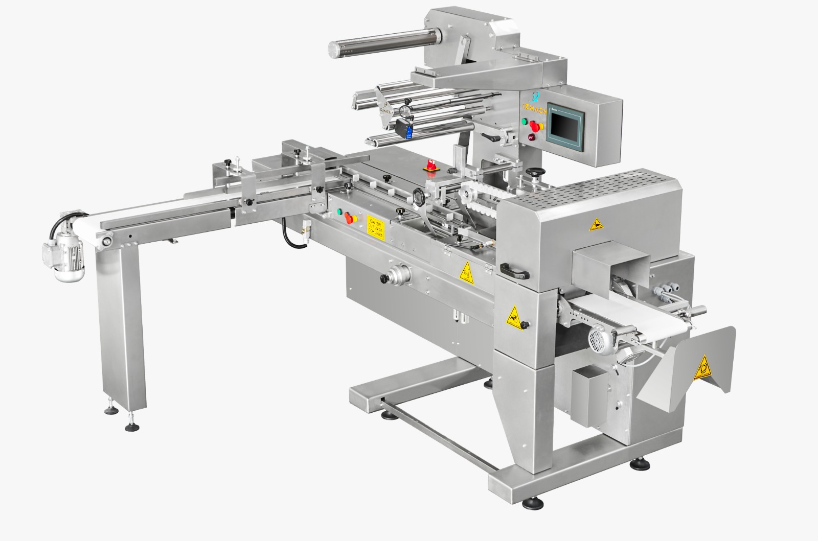 Gelişmiş Kontrol Ünitesi: PLC tabanlı kontrol sistemi ve kullanıcı dostu dokunmatik ekran arayüzü sayesinde; ürün paket boyu, fotosel ayarı ve makine hızına kolayca erişim ve müdahale imkânı sağlar. Servo Motor Teknolojisi: Makine, hassas ve seri üretim sağlayan akıllı servo motor otomasyon sistemi ile donatılmıştır. Akıllı Sensör Sistemi: Roll ekmek ve diğer ürünlerin paketlenmesi esnasında sıkışmayı önleyen ve ürün akışını denetleyen kontrol sensörleri mevcuttur. Ürün Koruma ve Hassasiyet: Paketleme mekanizması ürüne zarar vermeyecek (ezmeyecek) şekilde tasarlanmıştır. Akıllı göz sensörü, ürünün yanlış konumlanması durumunda makineyi otomatik olarak durdurur. Hijyenik Yapı: Gıda ile temas eden tüm yüzeyler ve çevre muhafazaları, gıda güvenliği standartlarına uygun AISI 304 kalite paslanmaz krom-nikel malzemeden imal edilmiştir. İş Güvenliği: Operatör ve makine güvenliğini sağlamak amacıyla stratejik noktalarda "Acil Stop" butonları konumlandırılmıştır. Veri Takibi ve Arıza Teşhisi: Paketlenen ürün bilgilerini doğrulama sistemi mevcuttur. Olası arızalarda, arızalı parçanın görseli ve ismi dokunmatik ekranda operatöre bildirilir. Yüksek Üretim Kapasitesi: Dakikada maksimum 180 adet, saatte ortalama 11.000 adet paketleme kapasitesine sahiptir (Ürün niteliğine göre değişkenlik gösterebilir). Firesiz Döner Çene Sistemi: Ambalajı sıkıştırarak kapatan dörtlü döner çene sistemi, sürekli akış sağlayarak fire kaybı olmaksızın çalışır. Her tam turda iki ürün paketleyerek "boşa dönüş" yapmadan maksimum verimlilik sağlar. Ekonomik Ambalaj Maliyeti: Firmamıza özel tasarım sayesinde sistem, minimum 20 mikron kalınlığındaki ambalaj bobinleriyle çalışabilir; bu özellik ambalaj maliyetlerini düşürür. Kullanım ve Bakım Kolaylığı: Ergonomik tasarımı sayesinde kullanımı kolay, temizliği pratiktir. Hızlı Bobin Değişimi: Pnömatik (hava sistemli) ve PLC kontrollü şaft sistemi sayesinde bobin söküp takma işlemi hızlı ve basittir. Alt yapıştırma sistemi de hava desteğiyle çalışır. Otomatik Gergi Kontrolü: Firmamıza özgü geliştirilen "Bobin Gergi Sistemi", bobinin ağırlığına ve kalınlığına göre gerginliği otomatik olarak ayarlar. Çok Amaçlı Kullanım: Roll ekmek paketlemesi için optimize edilmiş olan makine, talep edildiğinde basit modifikasyonlarla farklı ürünler için de kullanılabilir.