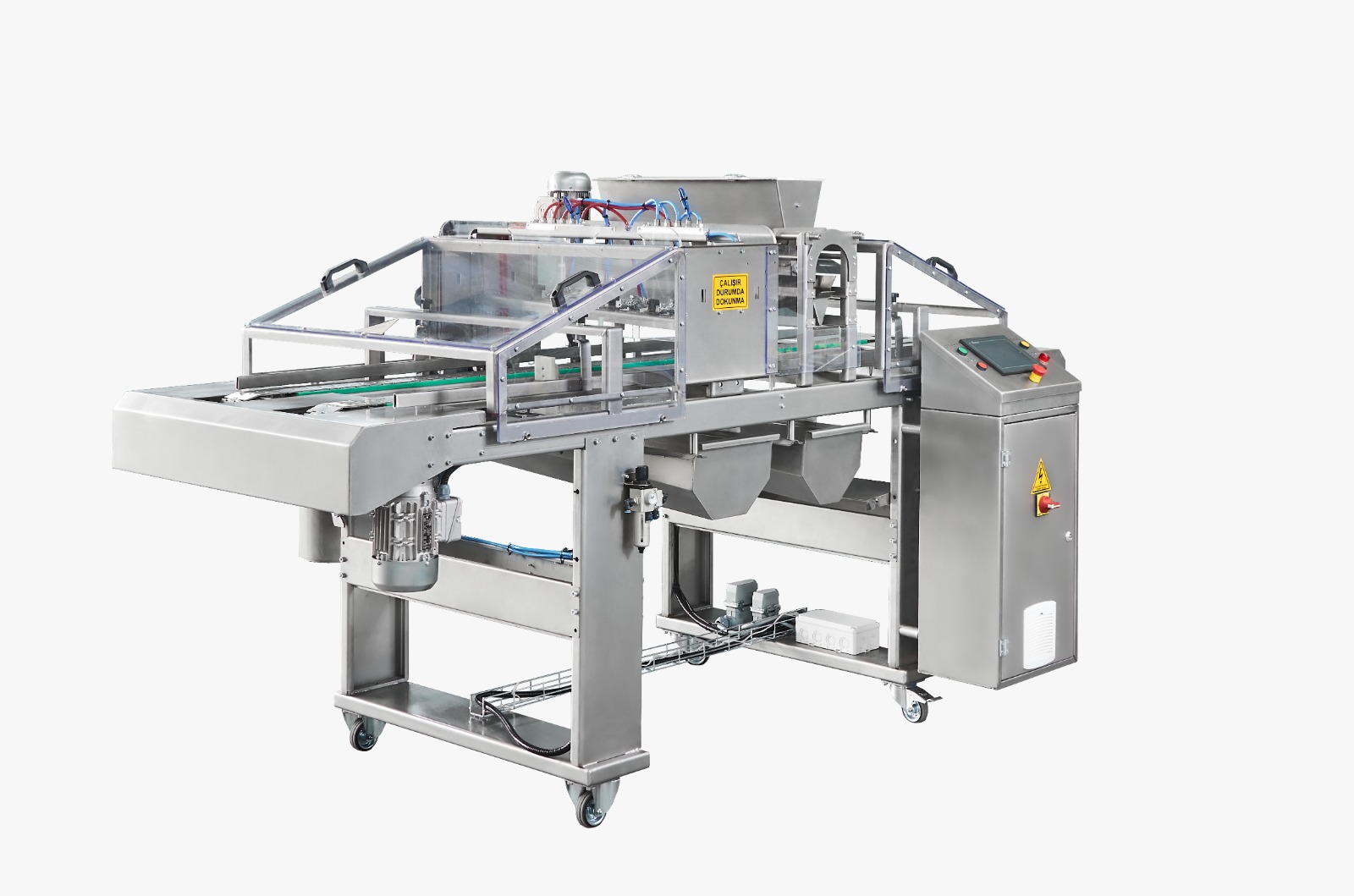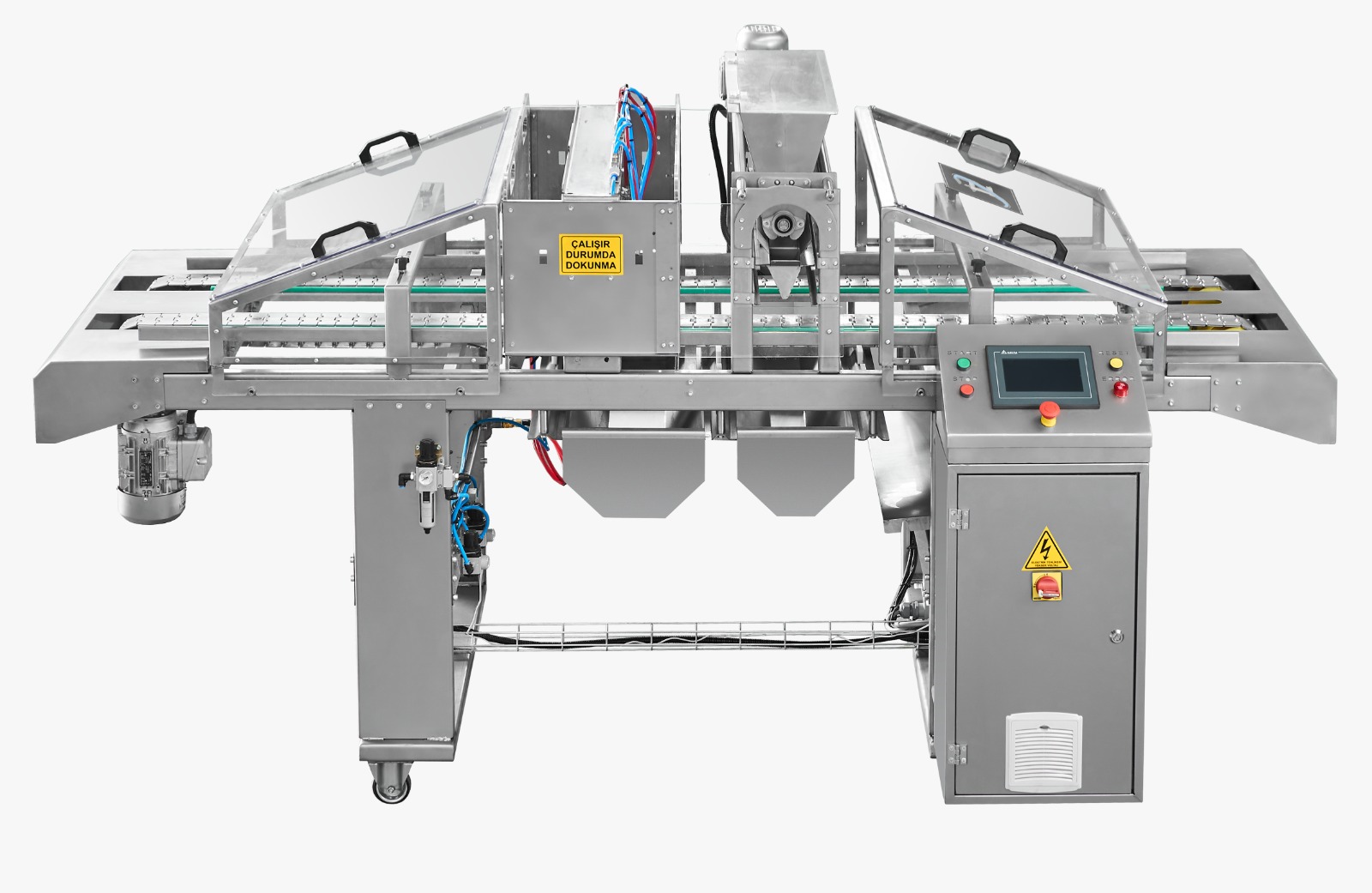 Akıllı Hafıza Sistemi: Operasyonel parametreler ve reçeteler hafızaya kaydedilerek, tekrarlayan üretim süreçlerinde hızlı ve pratik kullanım sağlar. Kolay Bakım ve Hijyen: Ergonomik tasarımı sayesinde günlük temizlik ve bakım işlemleri zahmetsizce gerçekleştirilebilir. Hassas Hız Kontrolü: Tüm konveyör bantların hızı, üretim gereksinimlerine göre bağımsız olarak ayarlanabilir. Gelişmiş Arıza Teşhisi: Olası elektrik ve elektronik arızalar, PLC ekranı üzerinden görsel ve yazılı bildirimlerle operatöre anlık olarak raporlanır.